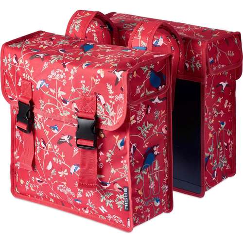 Basil Wanderlust-Double Bag. Dubbele fietstas, gemaakt van waterafstotend polyester, kliksluitingen, bovenzijde met twee banden t.b.v. LED/snelbinders/kinderzitje/veerklem, dubbele reflectiestrepen op alle zijkanten, inhoud: 35L, Vintage Red.
