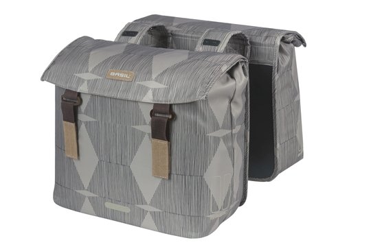 Basil Elegance dubbele fietstas, Choose green label, gerecycled PET polyester, geheel gevoerd, waterkerende vouwsluiting, Universal Bridge (geschikt voor Basil DBS, MIK, Racktime platen (apart verkrijgbaar)), reflectie, 40-49L, chateau taupe