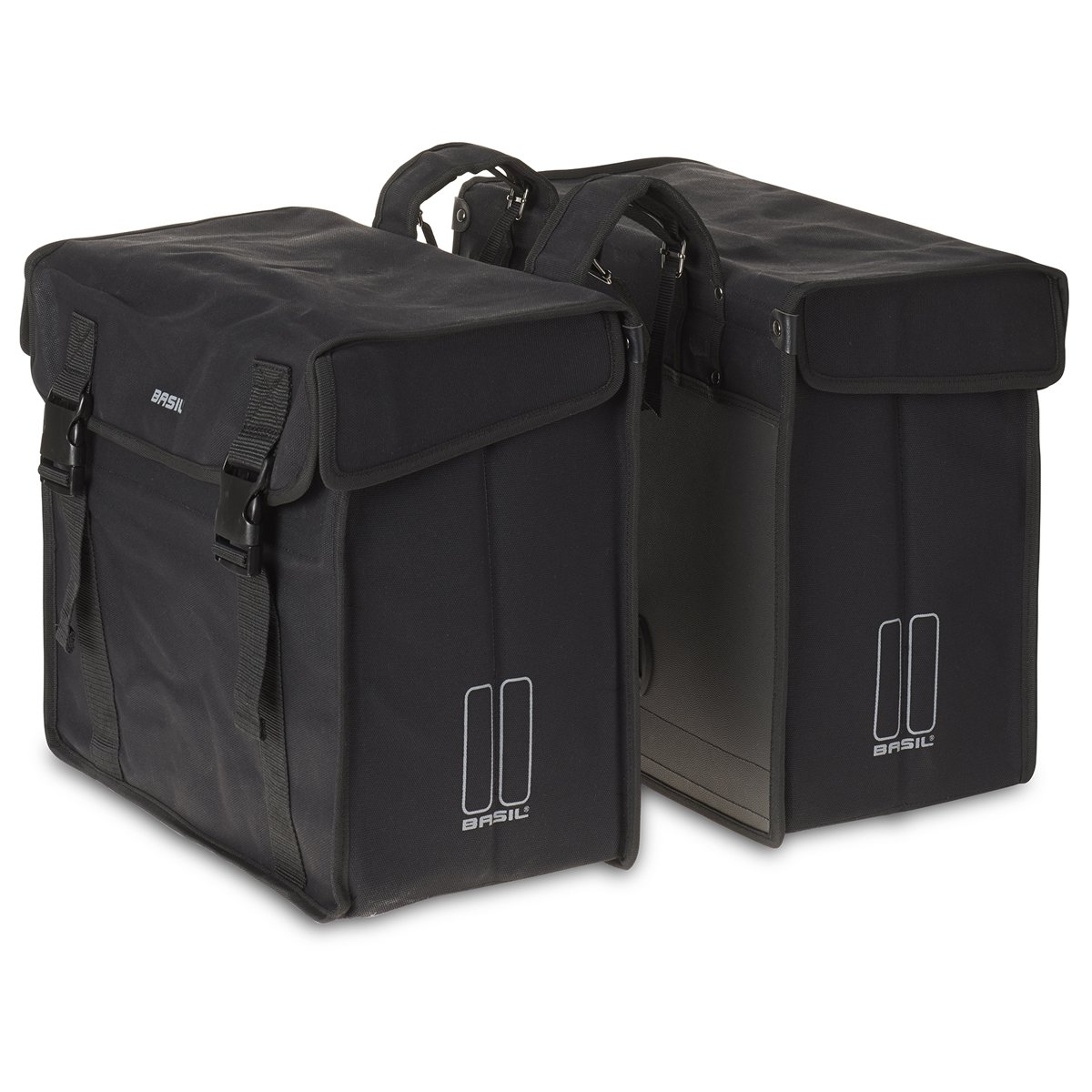 Basil Kavan XL. Dubbele fietstas, gemaakt van sterk en waterafstotend canvas, met Basil reflectiestrepen op alle zijkanten, verstevigde zijkanten en achterzijde, aansnoerband, bovenzijde 2 banden t.b.v. LED/snelbinders/kinderzitje/veerklem, waterafvoerputje, inhoud: 65L, Zwart.