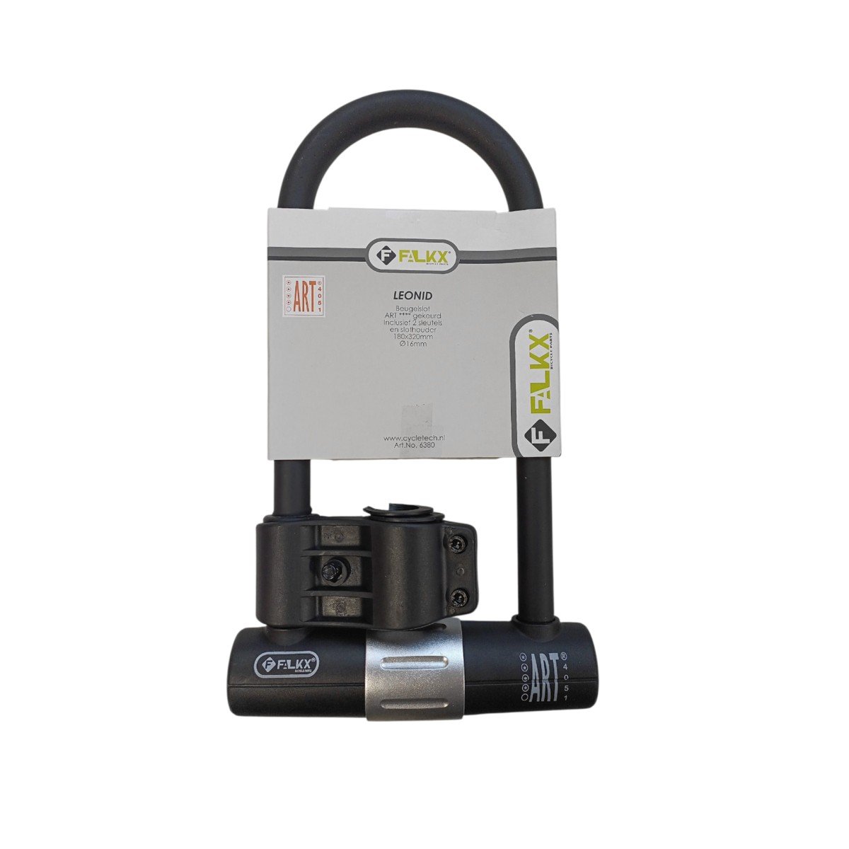 FALKX Leonid beugelslot • Het slot is ART**** gecertificeerd • De 16mm dikke beugel biedt uitstekende bescherming tegen pogingen tot openbreken of doorsnijden. • Met afmetingen van 180x320mm is het slot geschikt voor verschillende fietstypes. • Inclusief framehouder: Eenvoudig te bevestigen aan je fiets voor gemakkelijk transport.