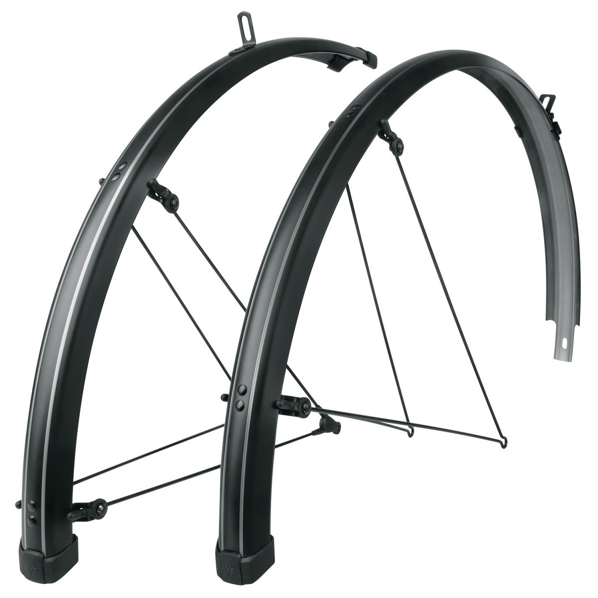 Spatbordenset in coole krijtstreep-look Nu nog breder, langer en stijlvoller! De matzwarte SKS spatbordenset BLUEMELS STRIPES in een grijze krijtstreep-look geeft de fiets een geweldige uitstraling. De zwarte stangen en de randbescherming met SKS-logo maken de strakke look helemaal af. De verlengde profielen zorgen voor een optimale bescherming tegen spatwater en vuil. Uitstekende bescherming dankzij langer profiel Dankzij de flexibele sandwichconstructie, waarin uiterst dunne aluminium strips zijn ingebed in een kunststof coating, zijn de spatborden extreem robuust, stijf en corrosiebestendig. Het ASR veiligheidssysteem voorkomt blokkeren van het wiel als er een tak tussen de spaken komt. Vaste bruggen en V-stangen zorgen voor een snelle montage met veel instelmogelijkheden. Inclusief stangenset, schuifbrug en bevestigingsmateriaal. • Aluminium/kunststof sandwichconstructie • Robuust, stijf en corrosiebestendig • ASR beveiligingssysteem • V-stangen voor eenvoudige montage • Vaste bruggen van roestvrij staal • Made in Germany artikelnummer: 11828 materiaal: Kunststof kleur: zwart-matt wielmaat: 27,5" (650b)", 28", 29 " wielbreedte in inches: 1.1-1.4 mm wielbreedte in mm: 28-37 mm lengte spatbord voor: 680 mm lengte spatbord achter: 1185 mm